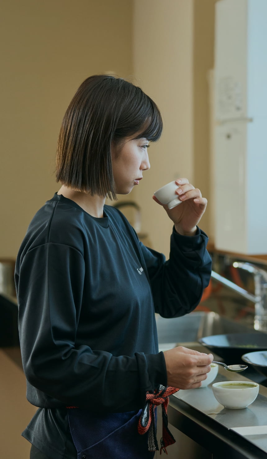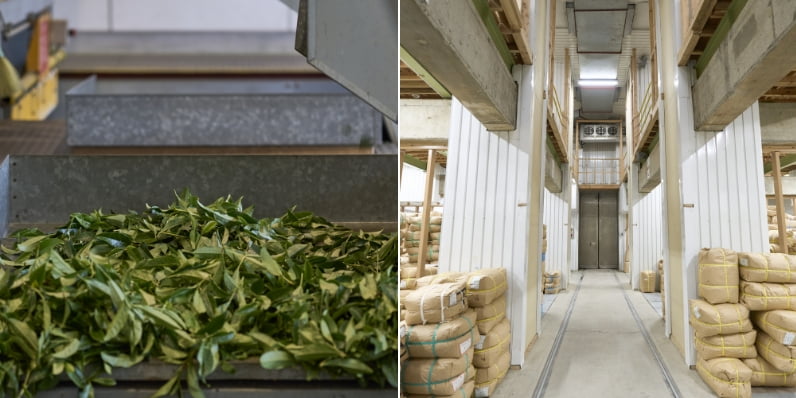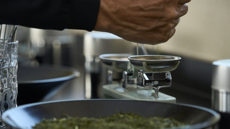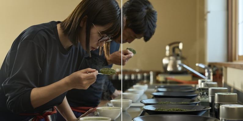 ブレンドや火入れなど様々な製造工程の間に必ず茶師による茶葉の「目利き」を行っています。