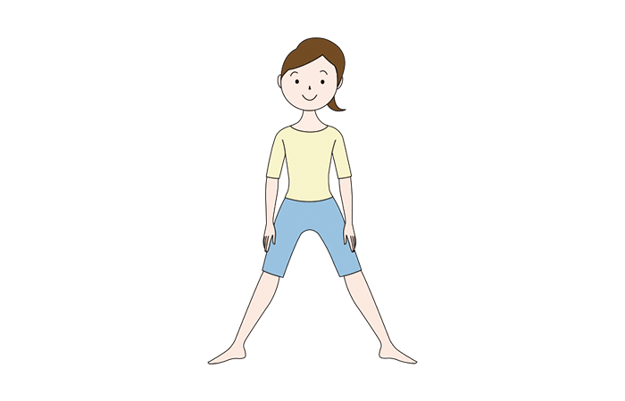 ①背筋を伸ばし、つま先を外に向けて立ちます。ゆっくり腰をおろしながら手を膝に置きます。