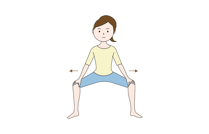 お相撲さんの四股踏みポーズで、股関節やももの内側、裏側を伸ばします。