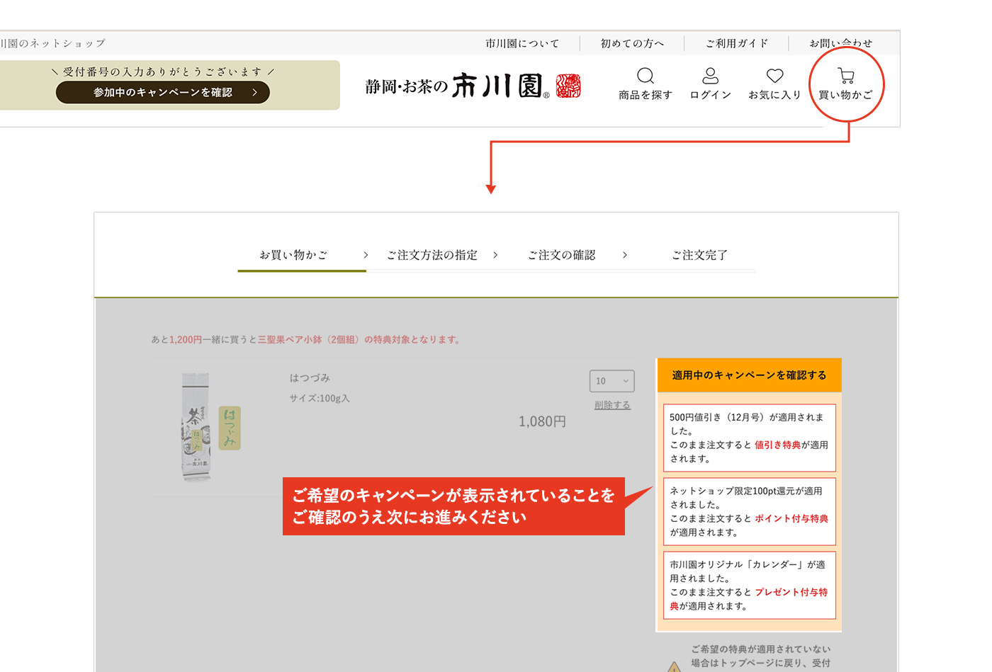 キャンペーンに参加したことをご確認のうえ、続けて商品カテゴリーや商品検索からご希望の商品をお選びいただき、お買い物かごにお入れください。