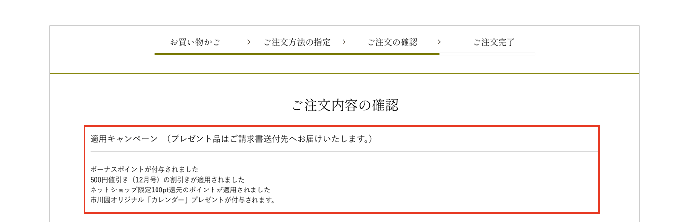 ⑤最後に「ご注文の確認」で再度、キャンペーンの適用をご確認のうえご注文を確定してください。