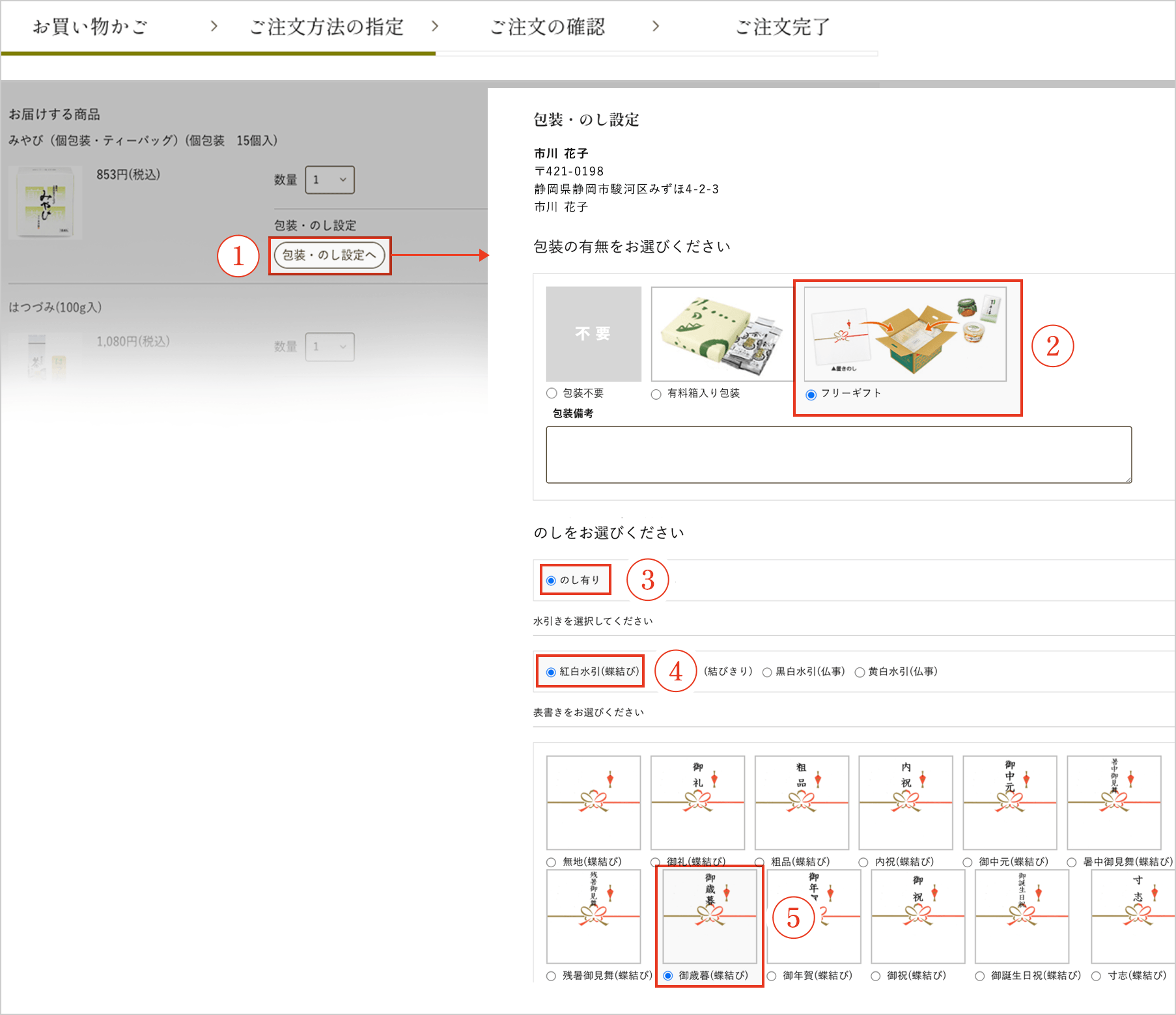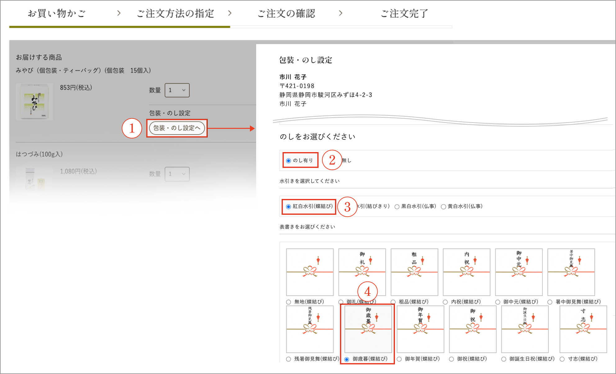 お買い物かご「ご注文方法の指定」にて[包装・のし設定へ]ボタンを押下いただき、御歳暮のしをお選びください。